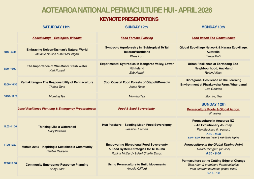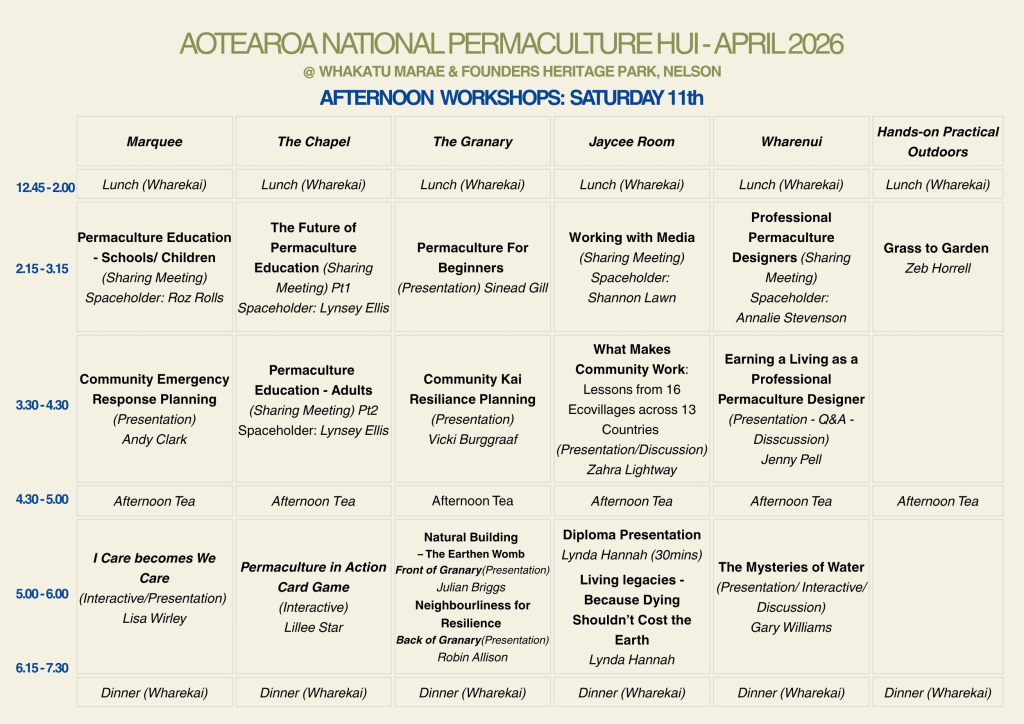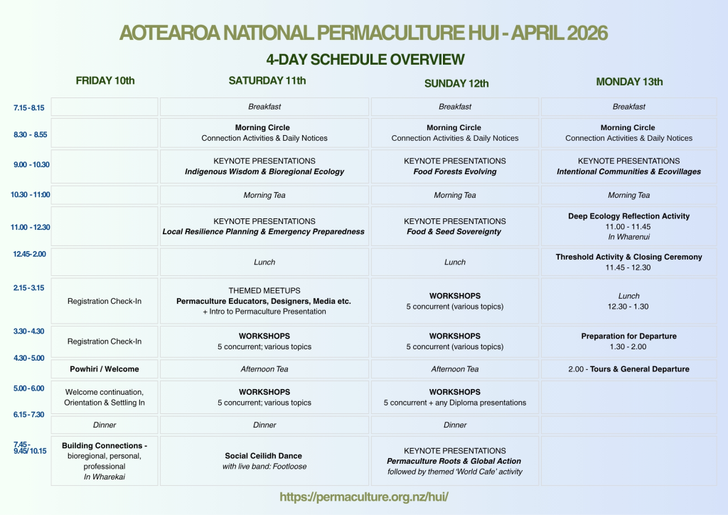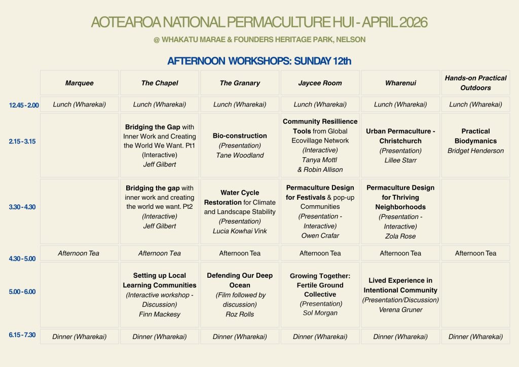 The hui offers an inspiring and enriching experience for all participants—introducing permaculture principles and concepts, fostering connection, and welcoming newcomers into the community. It’s a valuable opportunity to build relationships with aligned individuals, groups, and networks, and to contribute to positive change within our society.